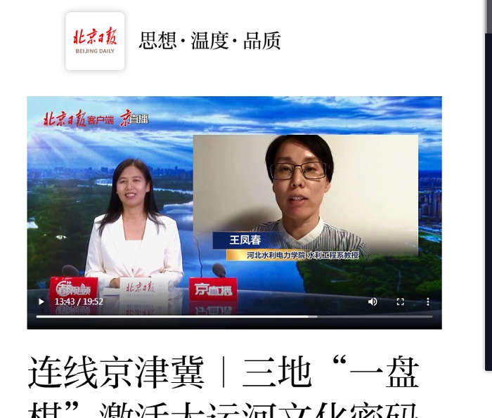 6月16日 ,《北京日报》“行走京津冀、看运河新韵”专栏刊登通讯报道《三地“一盘棋”激活大运河文化密码》,并在客户端“京直播”中视频连线beat365水利工程系副主任王凤春教授,邀请其就共建大运河文化带功能进行介绍...