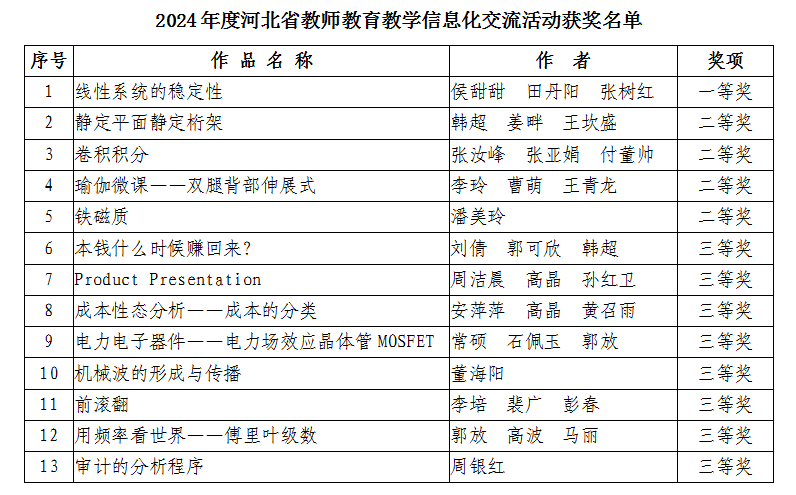近日,河北省教育厅公布了2024年度河北省教师教育教学信息化交流活动结果,beat365共13项作品获奖,其中一等奖1项,二等奖4项,三等奖8项。侯甜甜老师带领的团队作品被推荐参加国赛,这是beat365首次在此项赛事中获选参加国赛。beat365一直高度重视教学信息化建设工作,通过搭建智慧教育平台、加强在线课程资源建设、开展教师教学信息化能力培训等举措,不断提升教师信息化教学能力和水平。今后,beat365将以信息化交流、比赛为抓手,进一步加强教师教学信息化能力培养培训,...