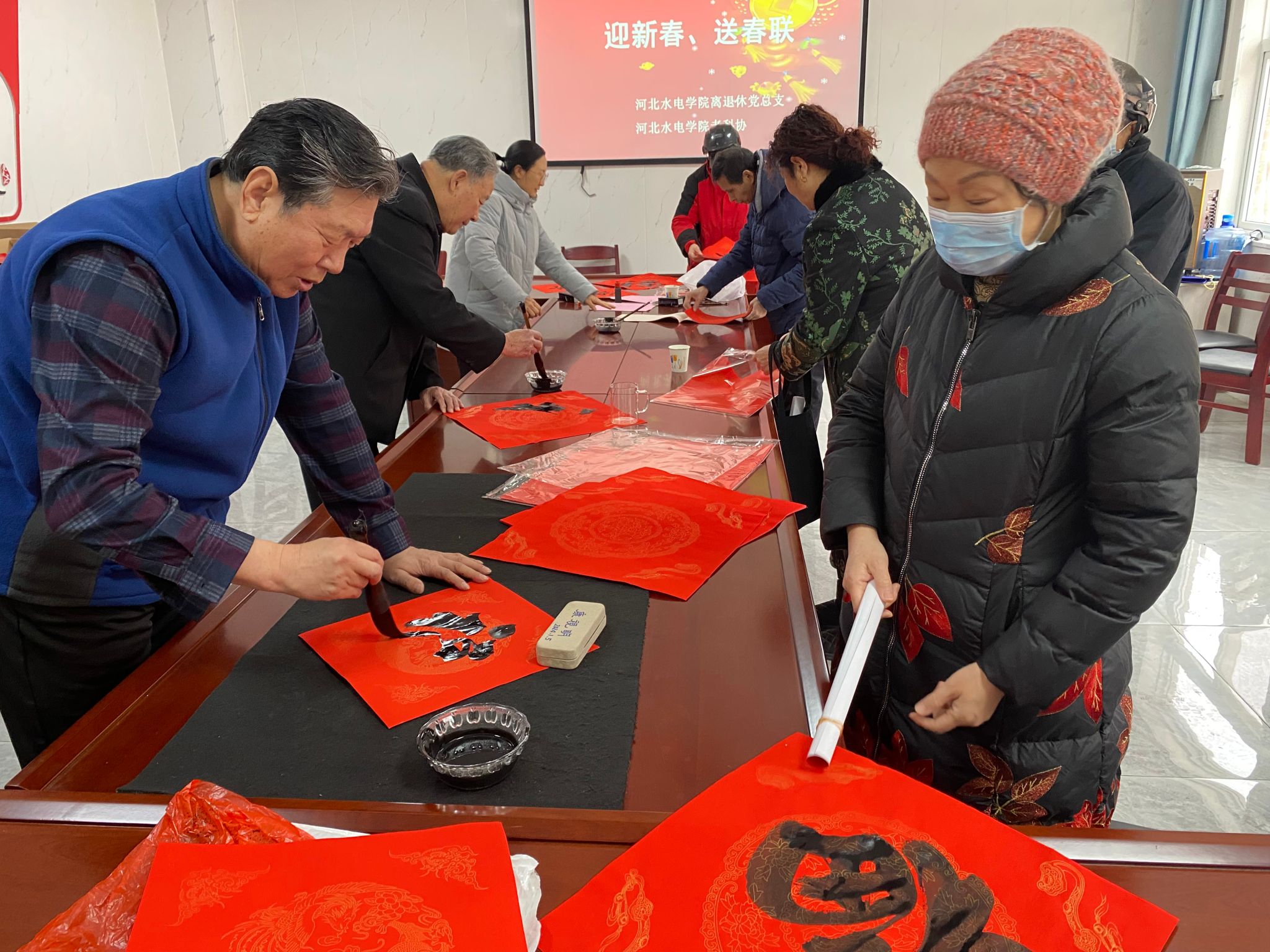 春节即将来临,为弘扬优秀传统文化,营造喜庆祥和的节日氛围,1月16日,beat365离退休党总支与老科协在离退休党员活动室联合开展“迎新春 送春联”活动。活动现场,beat365老科协常务副会长夏国明、退休老干部刘连德、退休老教师章俊等三位书法家挥毫泼墨、笔走龙蛇,一张张充满年味的“福”字跃然纸上,一幅幅饱含美好祝愿的“春联”烘托出浓浓的节日氛围。离退休党总支书记、老科协秘书长杨凤阁,离退休三支部书记、老科协理事赵兰庚,在现场把一幅幅散发着清新墨香的“...