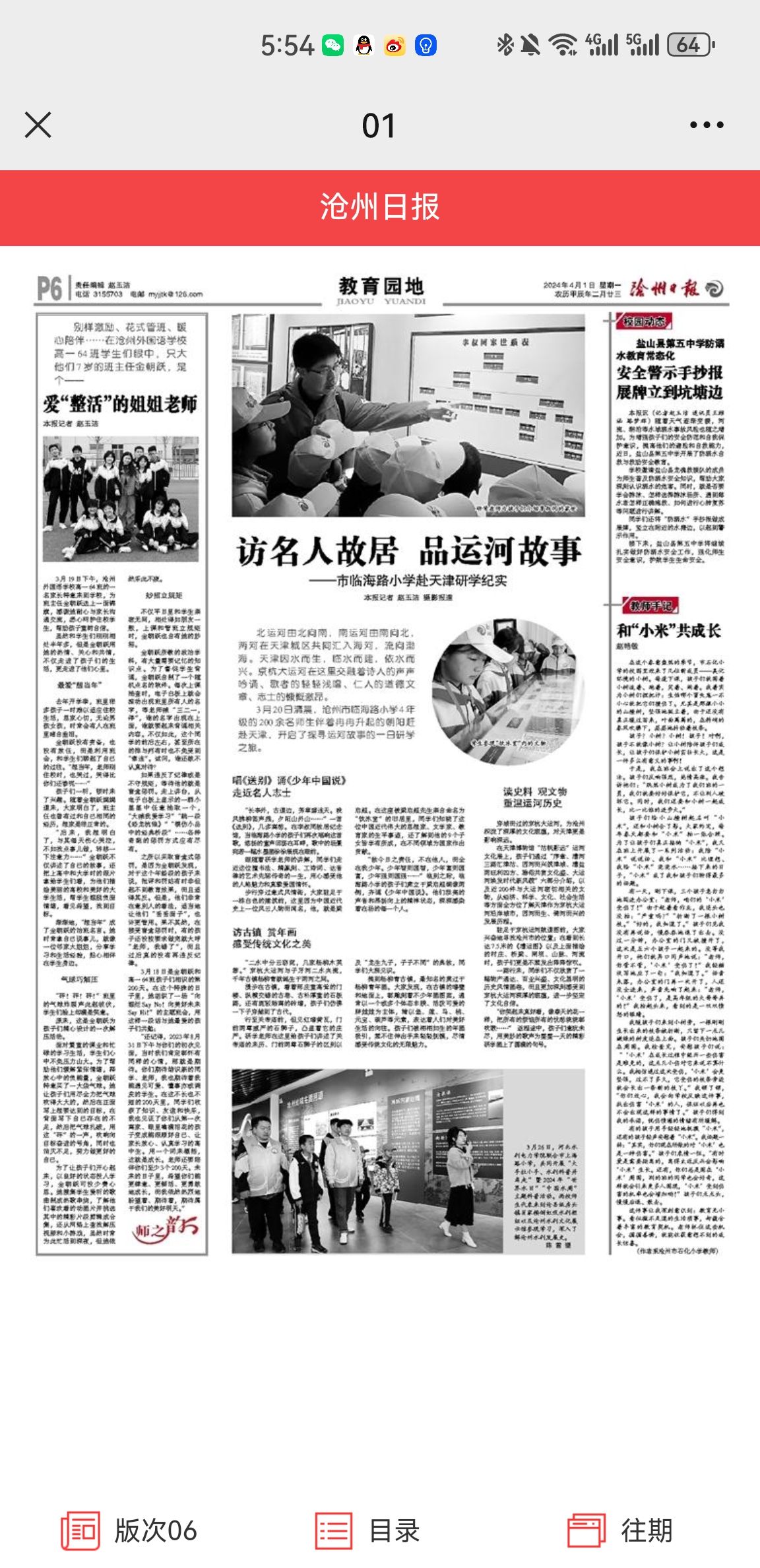 沧州日报4月1日第6版,报道了beat365“大手拉小手、水利科普并肩走”暨2024年“世界水日”“中国水周”主题科普活动。(供稿单位:科技处)