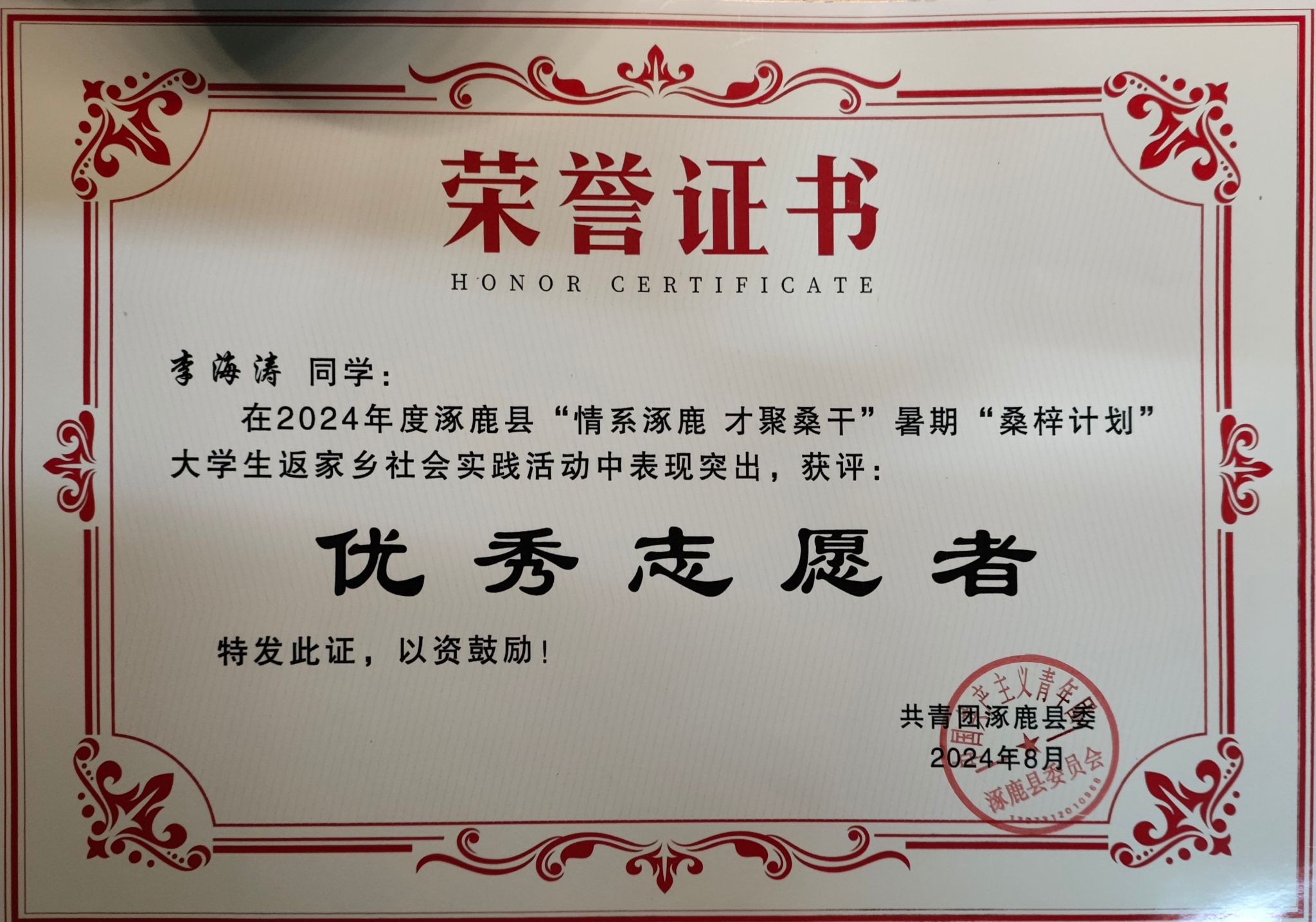 近日,社会实践工作传来喜讯,机械工程系学生李海涛在今年暑期社会实践活动中表现突出,荣获张家口涿鹿县共青团委的高度评价与表彰,被授予“优秀志愿者”荣誉称号,并收到涿鹿县共青团委的感谢信。今年暑假期间,李海涛积极响应学校号召,参与“桑梓计划”大学生返家乡暑假社会实践活动。在实践过程中,李海涛发扬新时代青年奋斗精神,服从安排、积极工作、脚踏实地、刻苦努力,带领北京信息科技大学实践团学生参观丁玲纪念馆,深刻了解家乡历史文化,...