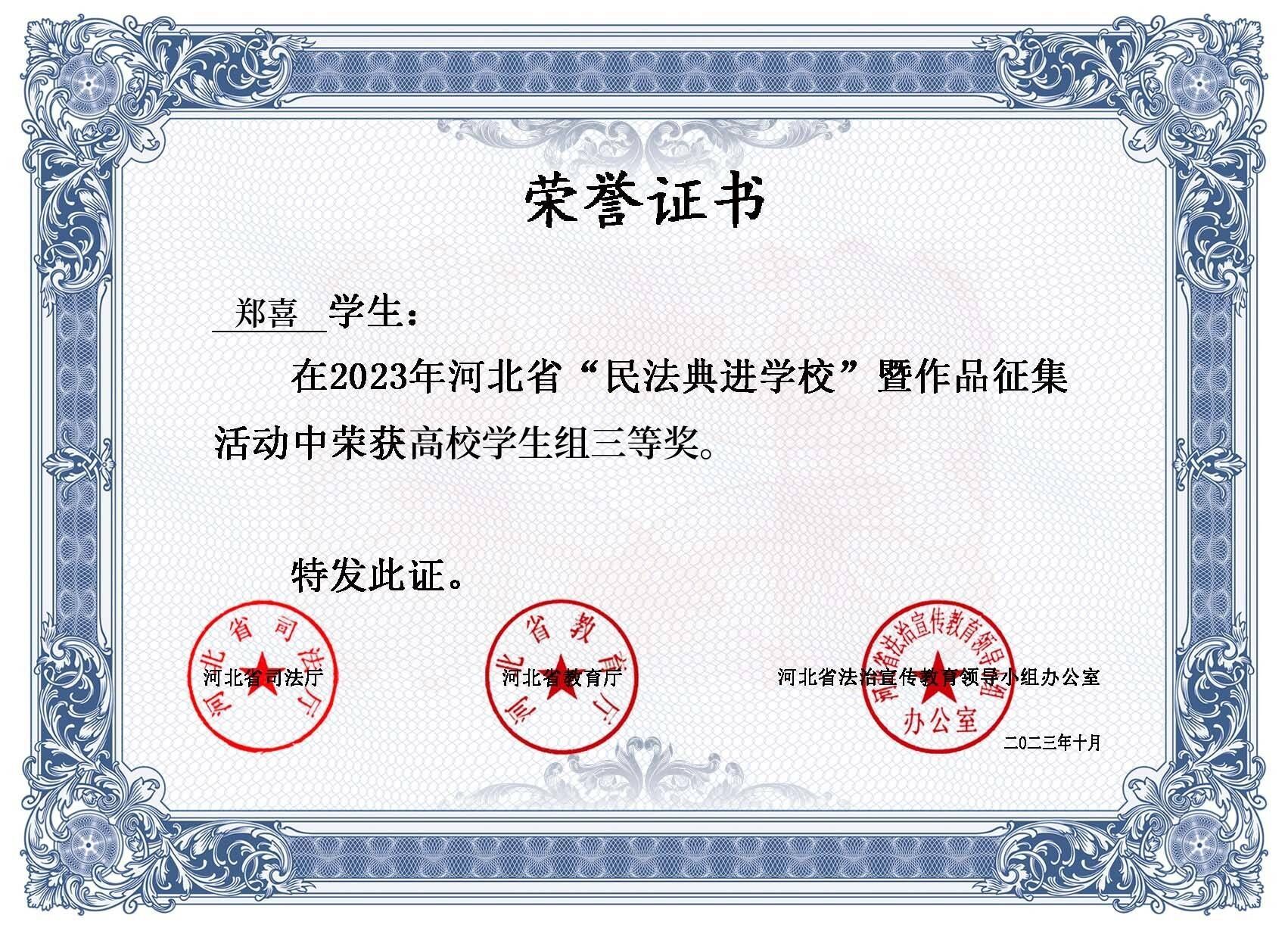 法与时转则治,治与世宜则有功。为深入学习贯彻习近平法治思想,深化民法典学习宣传,加强青少年民法典教育,引导学院广大师生学深、学懂、学透民法典精神,按照2023年“美好生活·民法典相伴”主题宣传活动要求和“每月一主题”普法宣传活动安排,2023年6月至8月,beat365按照省司法厅、省教育厅、省法治宣传教育领导小组办公室要求组织开展了“民法典进学校”暨作品征集活动。通过层层评选,beat365王玉洁老师和土木系郑喜同学于9月28日参加河北省“...