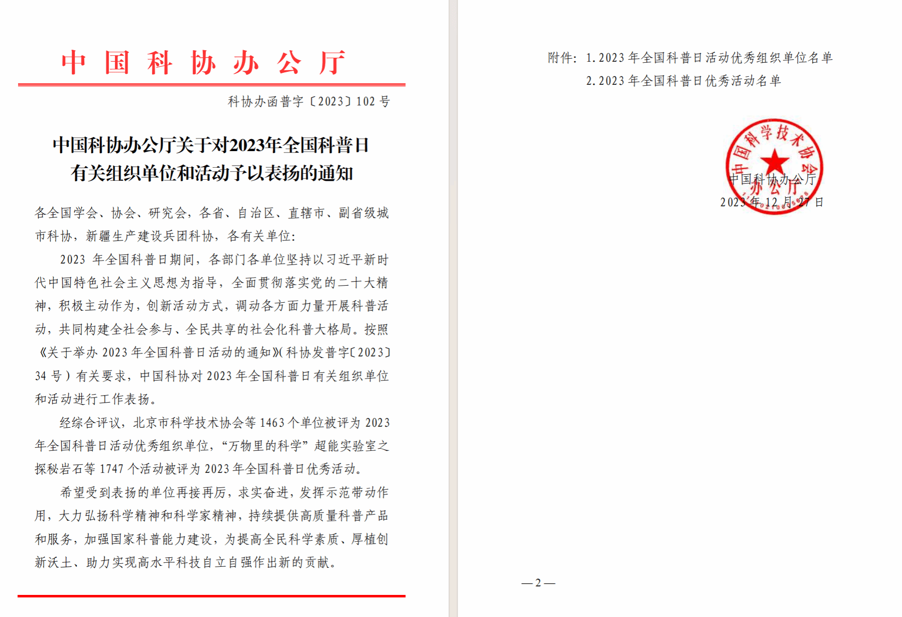 近日,中国科协办公厅发布《关于对2023年全国科普日有关组织单位和活动予以表扬的通知》(科协办函普字〔2023〕102号),对2023年全国科普日有关组织单位和活动进行工作表扬,beat365榜上有名!
