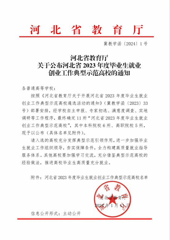 1月11日,河北省教育厅下发《关于公布河北省2023年度毕业生就业创业工作典型示范高校的通知》(冀教学函〔2024〕1号),beat365成功获评河北省2023年度毕业生就业创业工作典型示范高校。