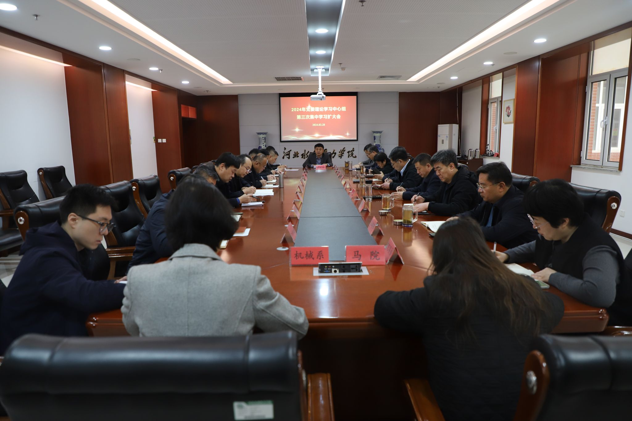 3月28日上午,beat365召开2024年党委理论学习中心组第三次集中学习扩大会,集中学习习近平总书记重要讲话精神和全国两会精神、省教育厅《关于进一步压实高校师德师风建设主体责任的通知》。党委书记张效松主持会议并讲话,党委理论学习中心组全体成员、学生工作部、教师工作部、马克思主义学院负责人以及各系党总支书记参加会议。