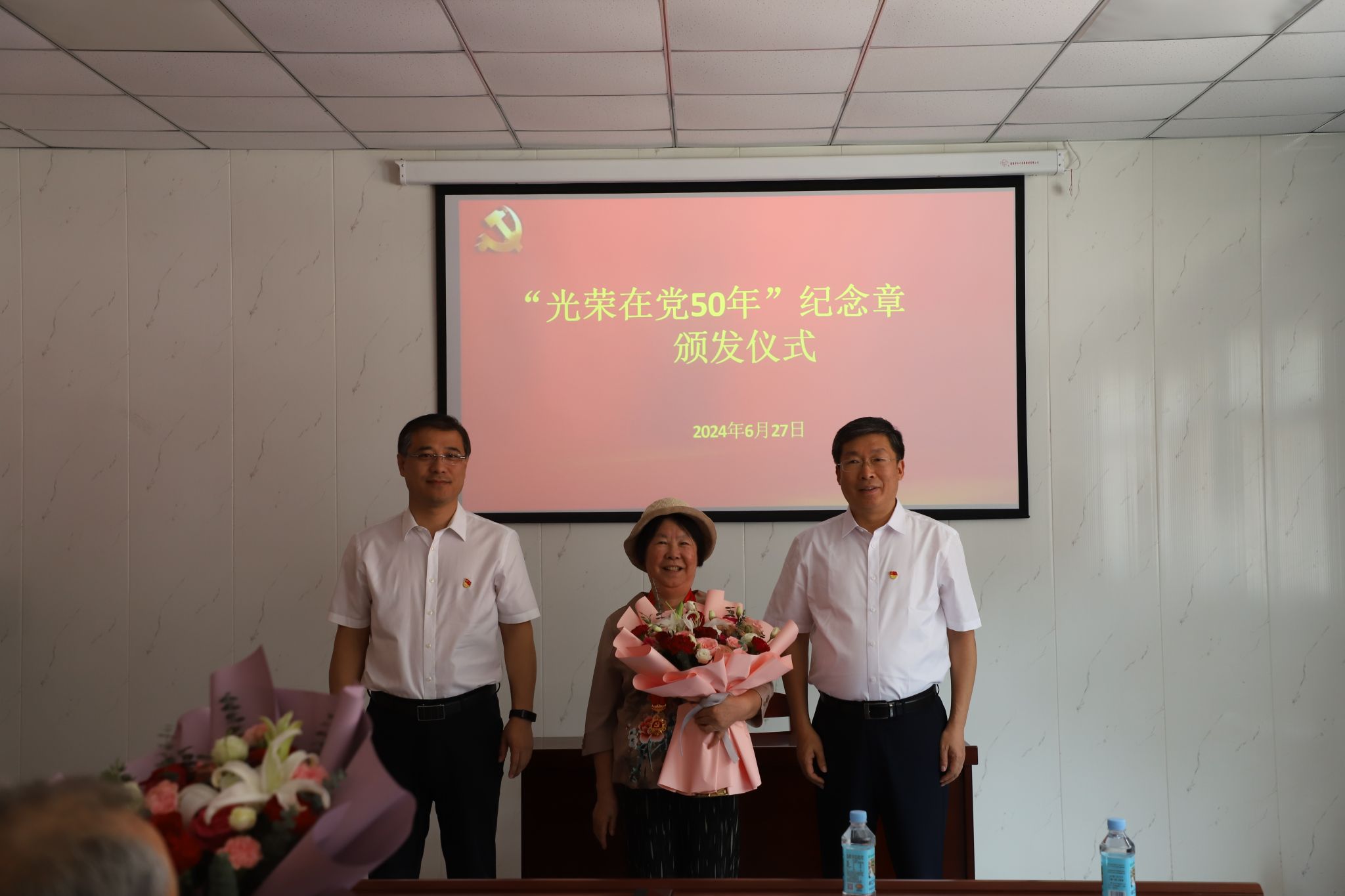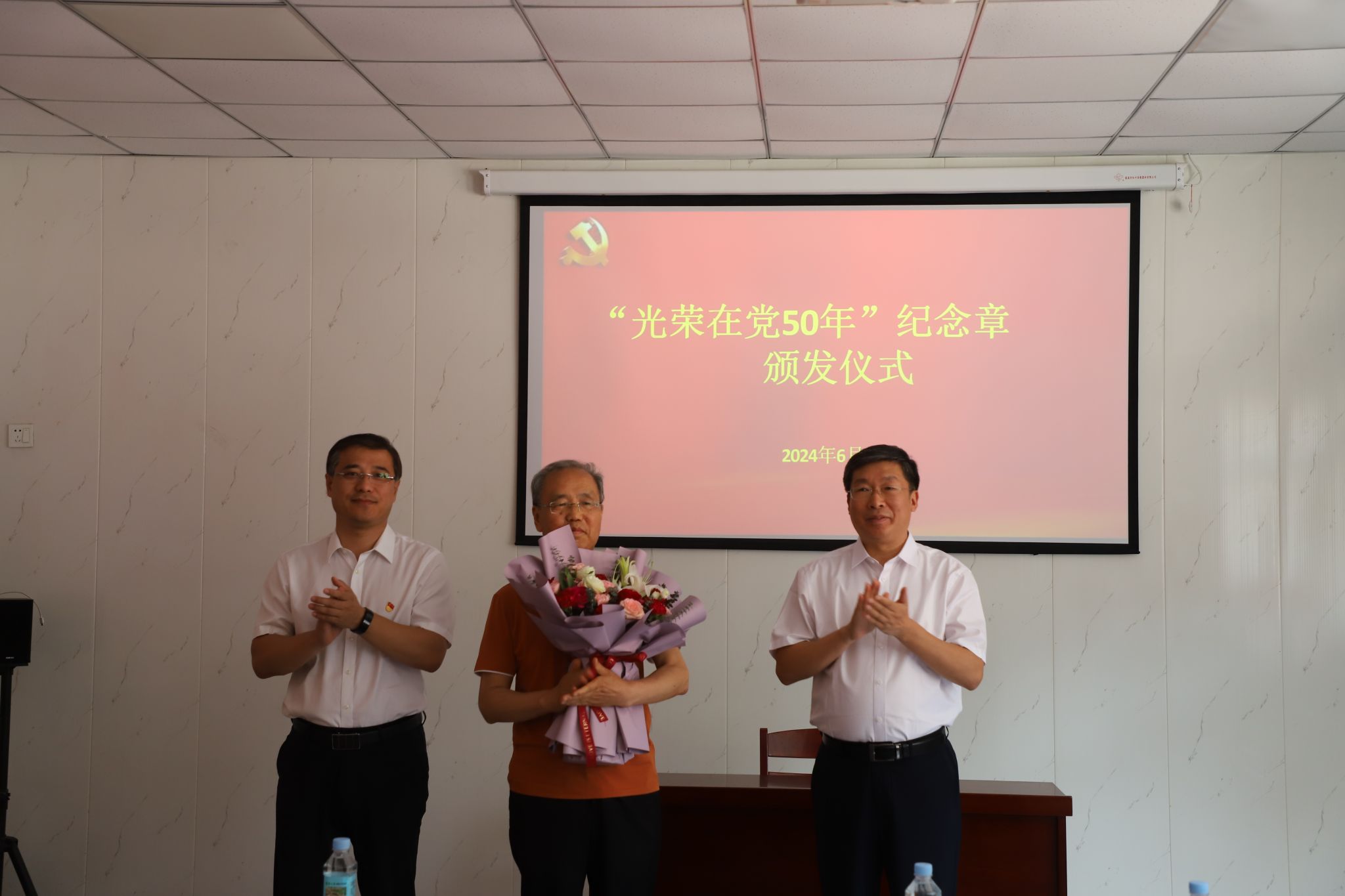 6月27日,在中国共产党成立103周年即将到来之际,beat365在离退休党员活动室举办“光荣在党50年”纪念章颁发仪式,副校长于振海、副校长杨凯出席仪式。仪式由离退休党总支书记杨凤阁主持。