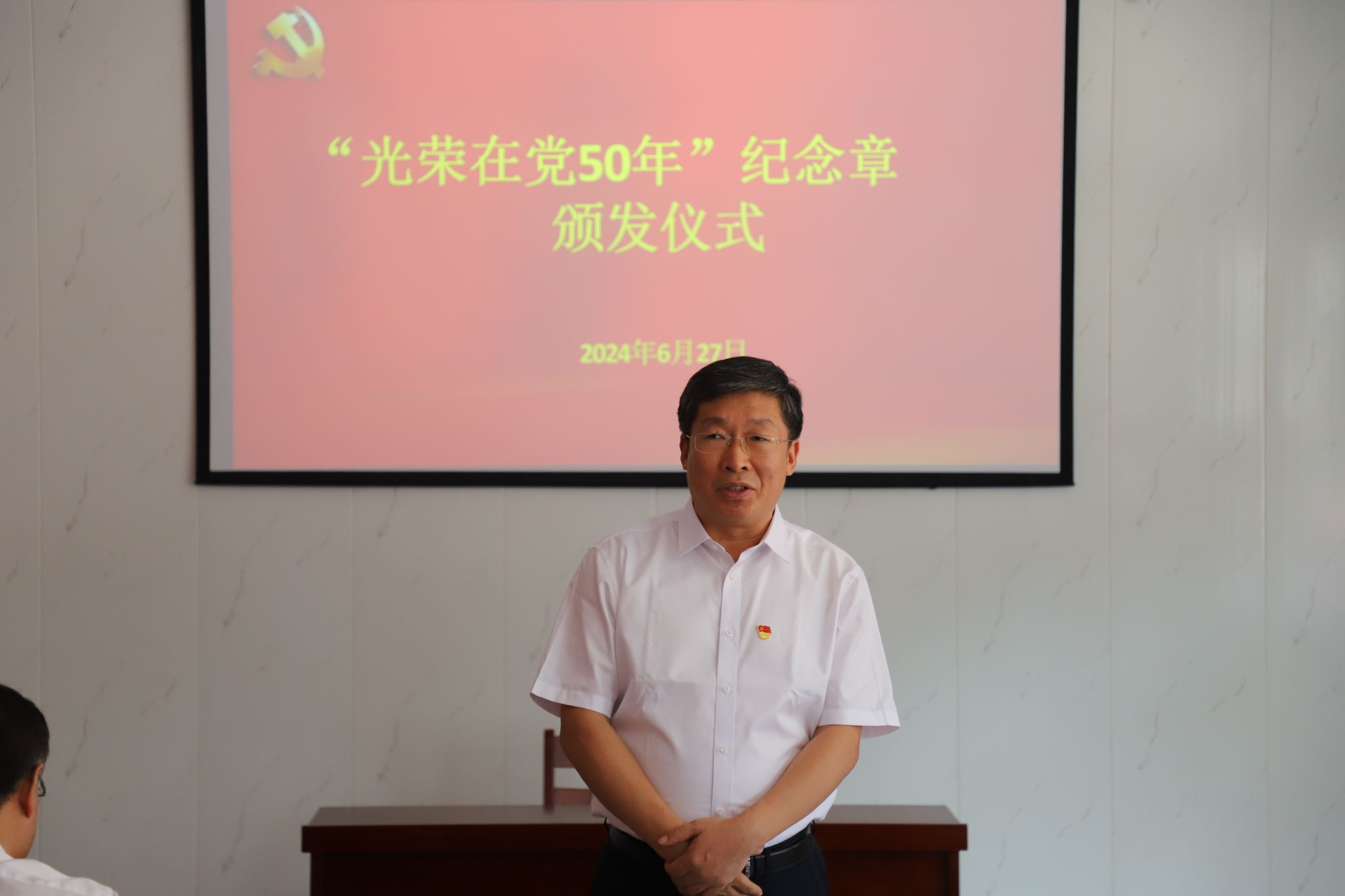 获得纪念章的老党员张玉岩现场发言,表达了自己对党组织的深厚感情。他表示,“光荣在党50年”纪念章代表着奋斗与光荣,也饱含着关怀与温暖。作为老党员,我们将时刻听从党的召唤,始终关心学校建设发展,发挥传帮带积极作用,老有所为、发光发热,做到退职不褪色、离岗不离党,用实际行动践行共产党员的初心和使命。