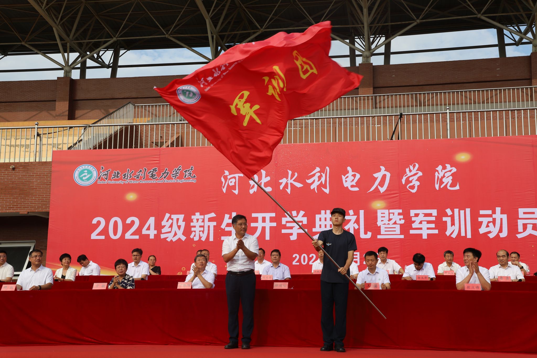 在雄壮的国歌声中,五星红旗冉冉升起,全体师生肃立注目,仪式正式拉开序幕。典礼仪式上,党委书记张效松为军训团授旗。