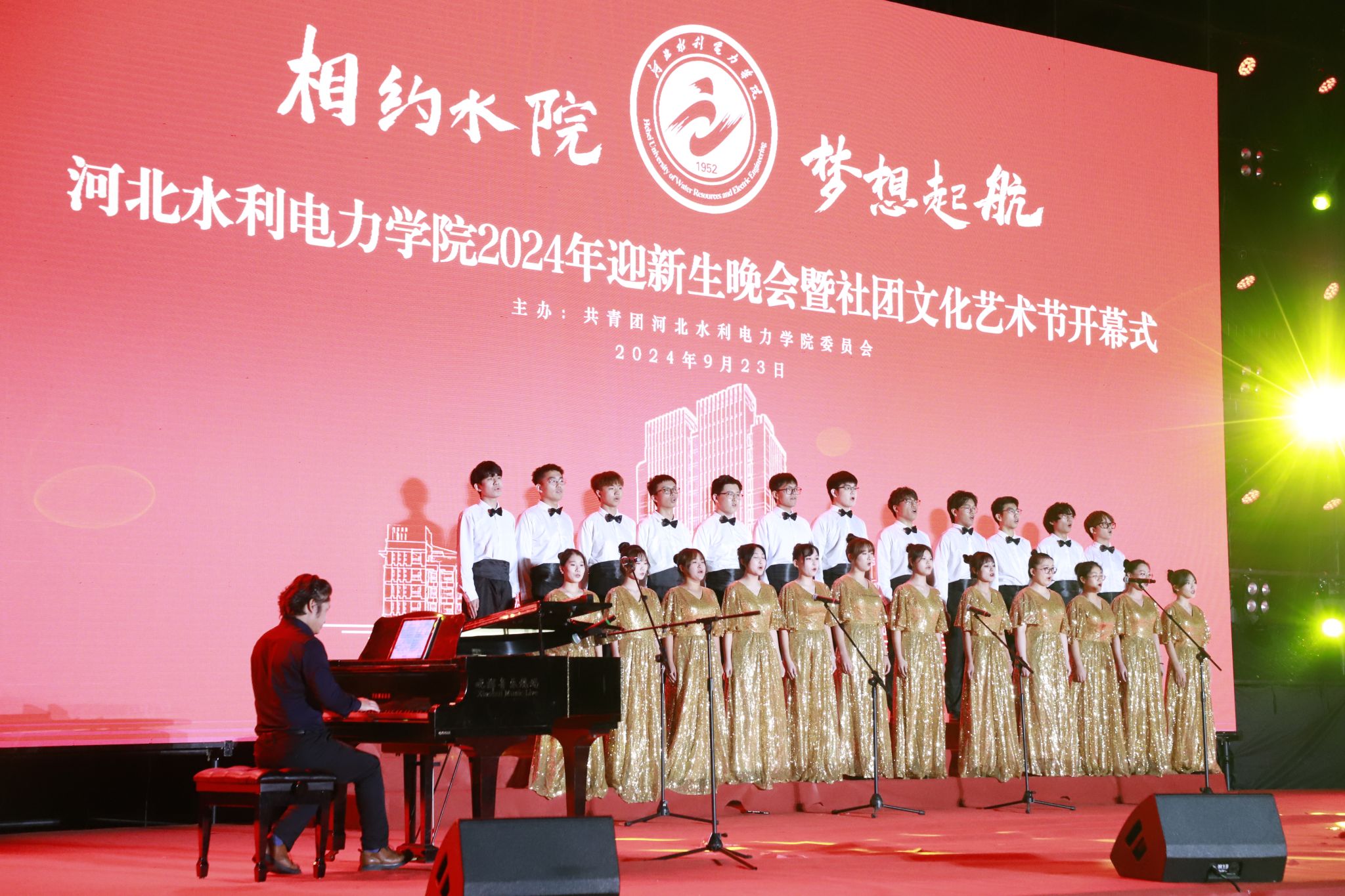 随着《我们都是水院人》MV的播放,晚会在热烈的掌声中正式拉开帷幕。学校啦啦操队的同学们用她们灵动的身姿演绎跳跃的音符,热情洋溢地为大家带来了《大红灯笼高高挂》啦啦操表演;《外面的世界》《月亮舞台》《明天你好》等歌曲唱出了学校对新同学的欢迎,希望他们在水院度过四年美好的青春,书写人生新的华章;河北知名青年钢琴家马晓辉为大家演奏了世界经典钢琴曲《钟》,演奏结束后他又与beat365大学生合唱团共同演绎合唱了《我和我的祖国》,为祖国母亲七十五周年华诞送上祝福。