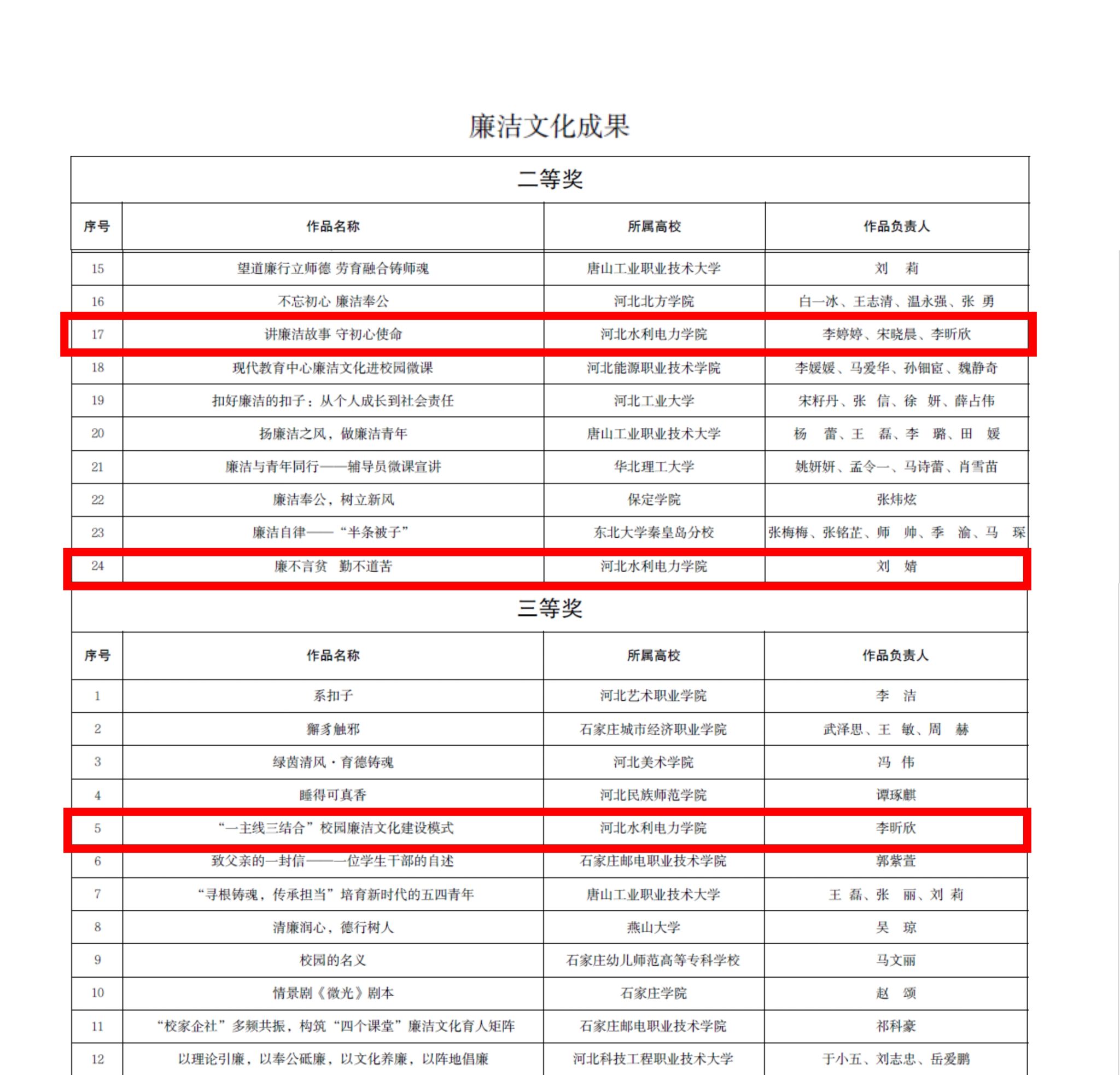 根据河北省委教育工委公布的2024年高校党建主题作品评选结果(河北省),上述两部廉洁教育微党课分别在活动中荣获二等奖,廉洁案例《“一主线三结合”校园廉洁文化建设模式》在该活动中荣获三等奖。