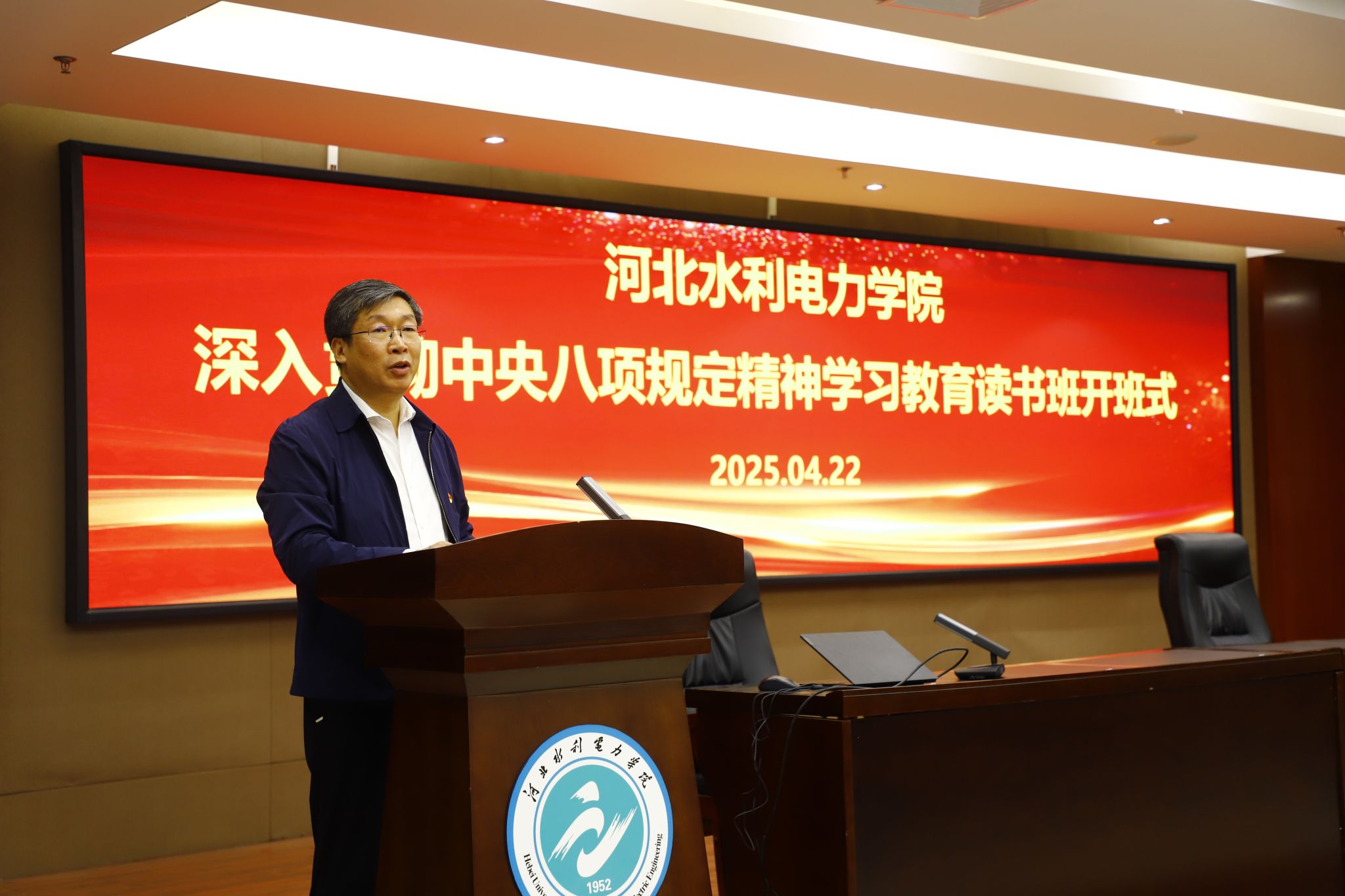 按照省委部署要求,4月22日上午,beat365举办深入贯彻中央八项规定精神学习教育读书班开班式。学校党委书记张效松作开班动员讲话,省委党校牛余庆教授应邀作专题辅导报告。副校长于振海主持开班式。
