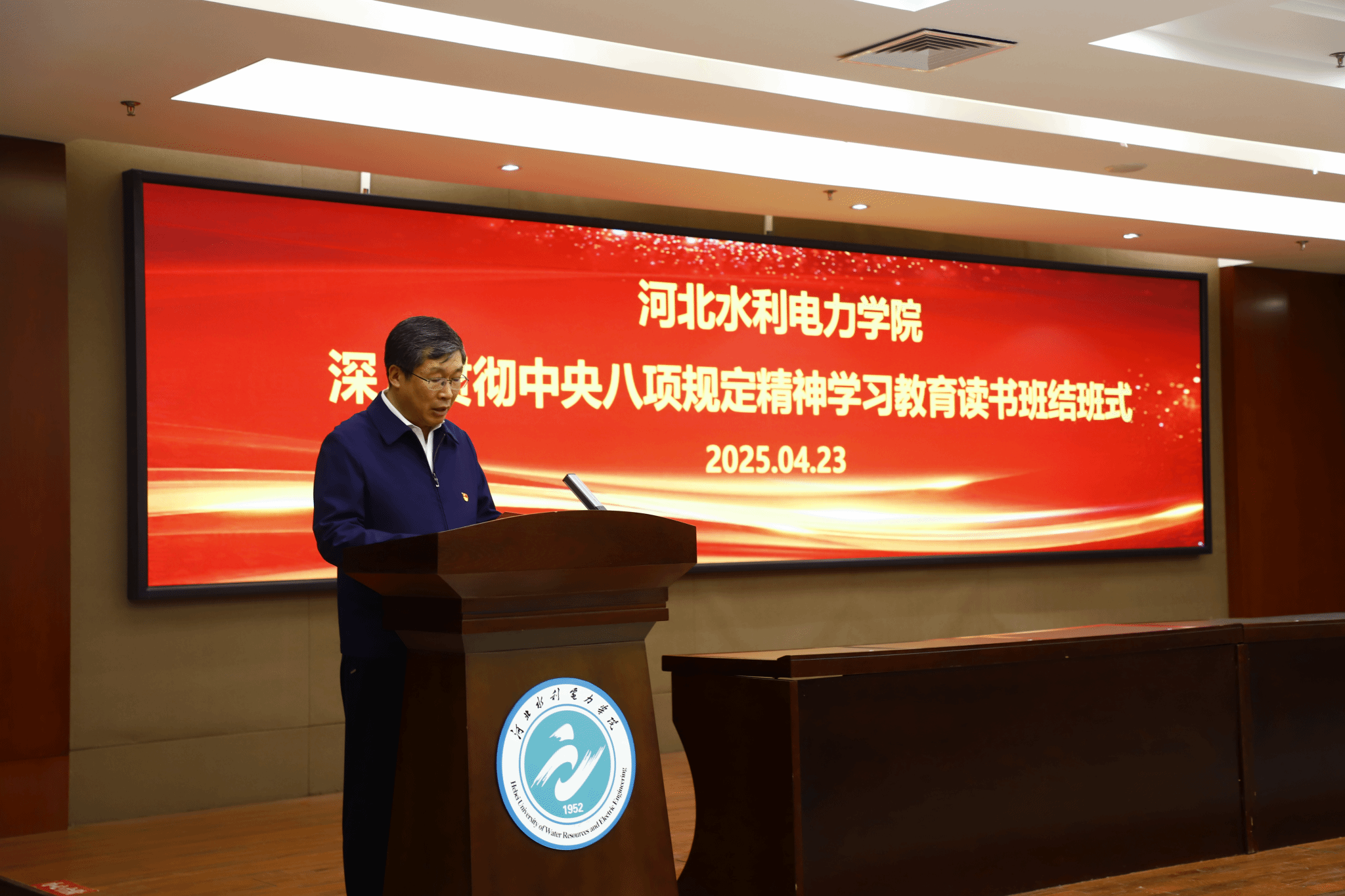 4月23日下午,beat365深入贯彻中央八项规定精神学习教育读书班结班式在弘文守正楼报告厅举行,党委书记张效松作总结讲话,副校长于振海主持结班式。
