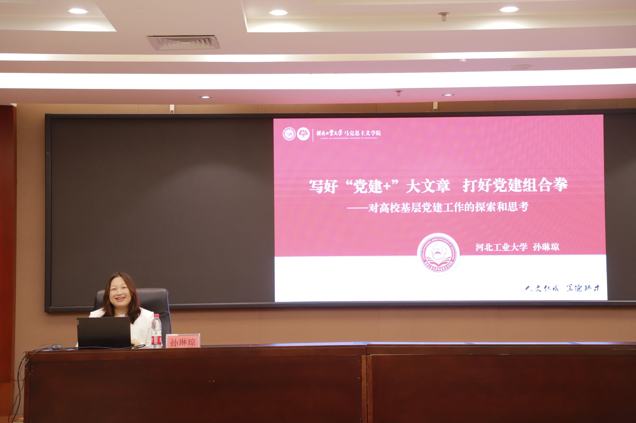 河北工业大学马克思主义学院院长孙琳琼作了题为“写好‘党建+大文章’ 打好党建组合拳”的专题讲座,深刻阐述了新形势下高校党建工作的创新理念与实践路径,强调了运用系统思维和组合策略提升党建质量对于引领高校发展的重要性。讲座中,孙院长围绕三个核心维度展开了深入讲解:一是提升理论思维的时代要求;二是对高校基层党建工作的探索;三是对做好高校基层工作的思考。