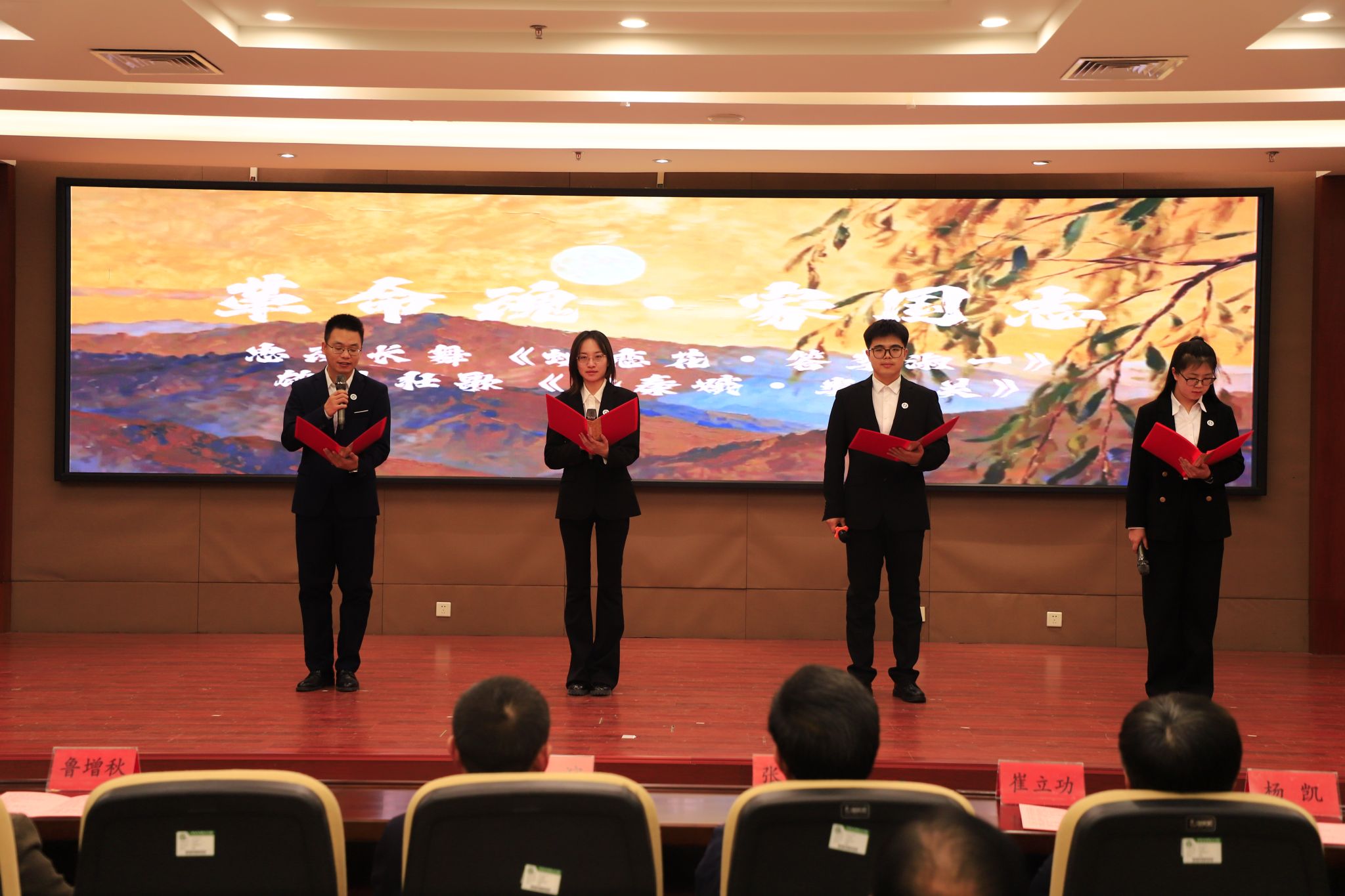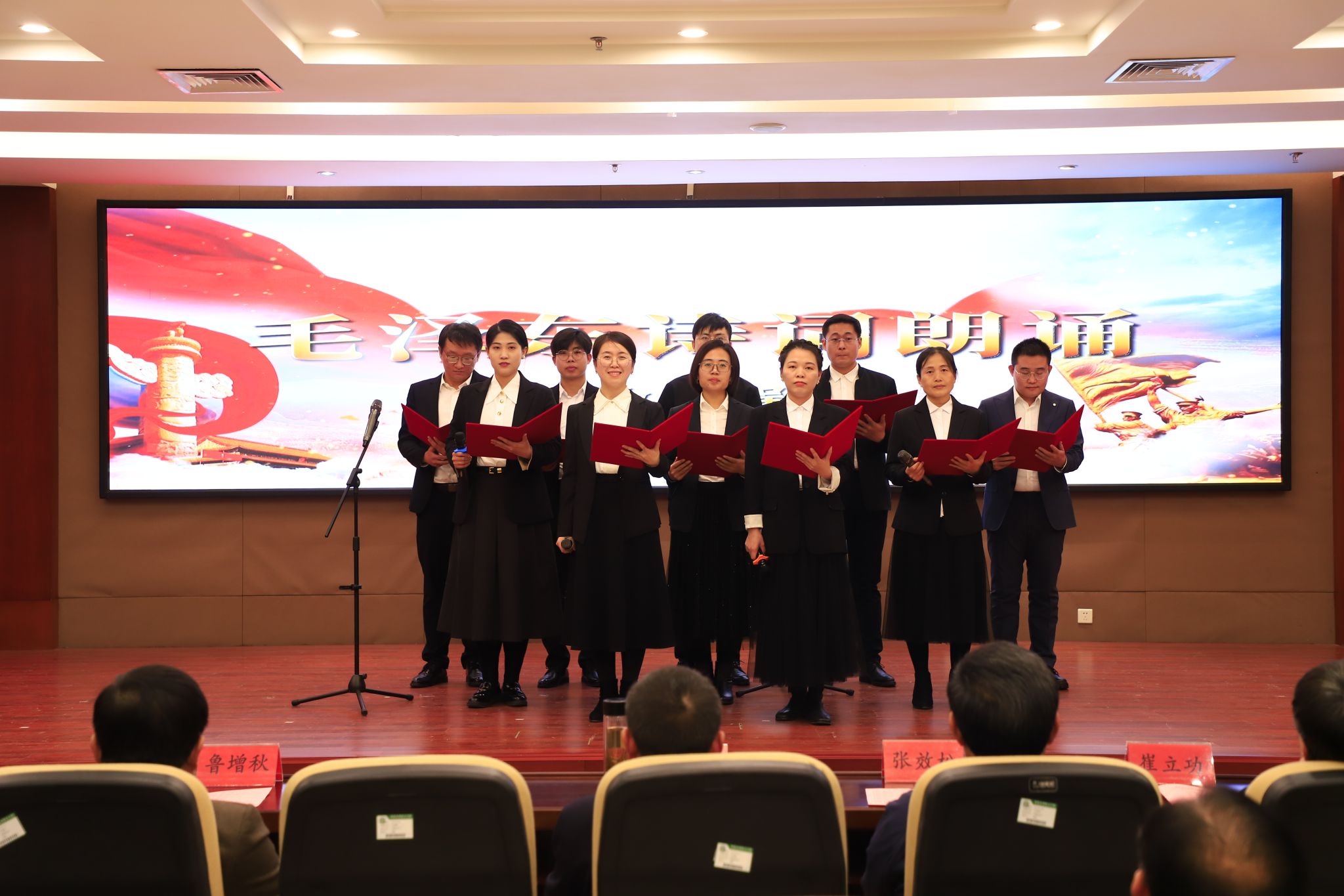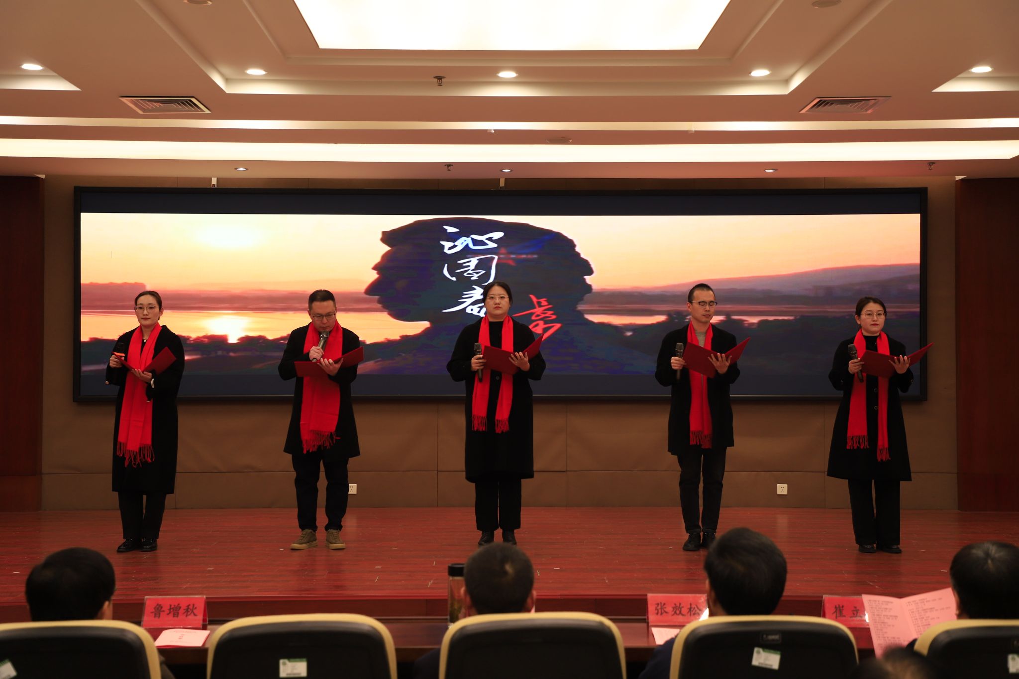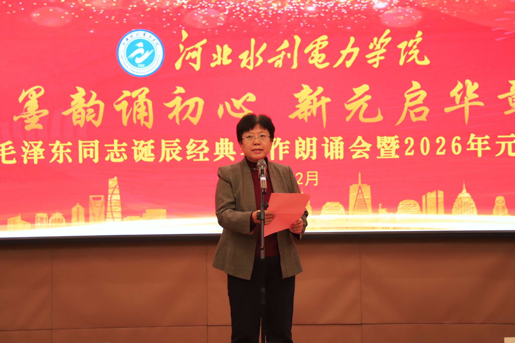 为深切缅怀毛泽东同志的丰功伟绩,传承红色基因,弘扬革命精神,凝聚全校奋进力量,迎接新年的到来,12月26日下午,以“墨韵诵初心 新元启华章”为主题的教职工纪念毛泽东同志诞辰经典著作朗诵会暨元旦联欢会在弘文守正楼九楼报告厅举行。教职工们齐聚一堂,在经典诵读中感悟初心,在文艺演出中展望未来,学校领导班子成员出席活动。