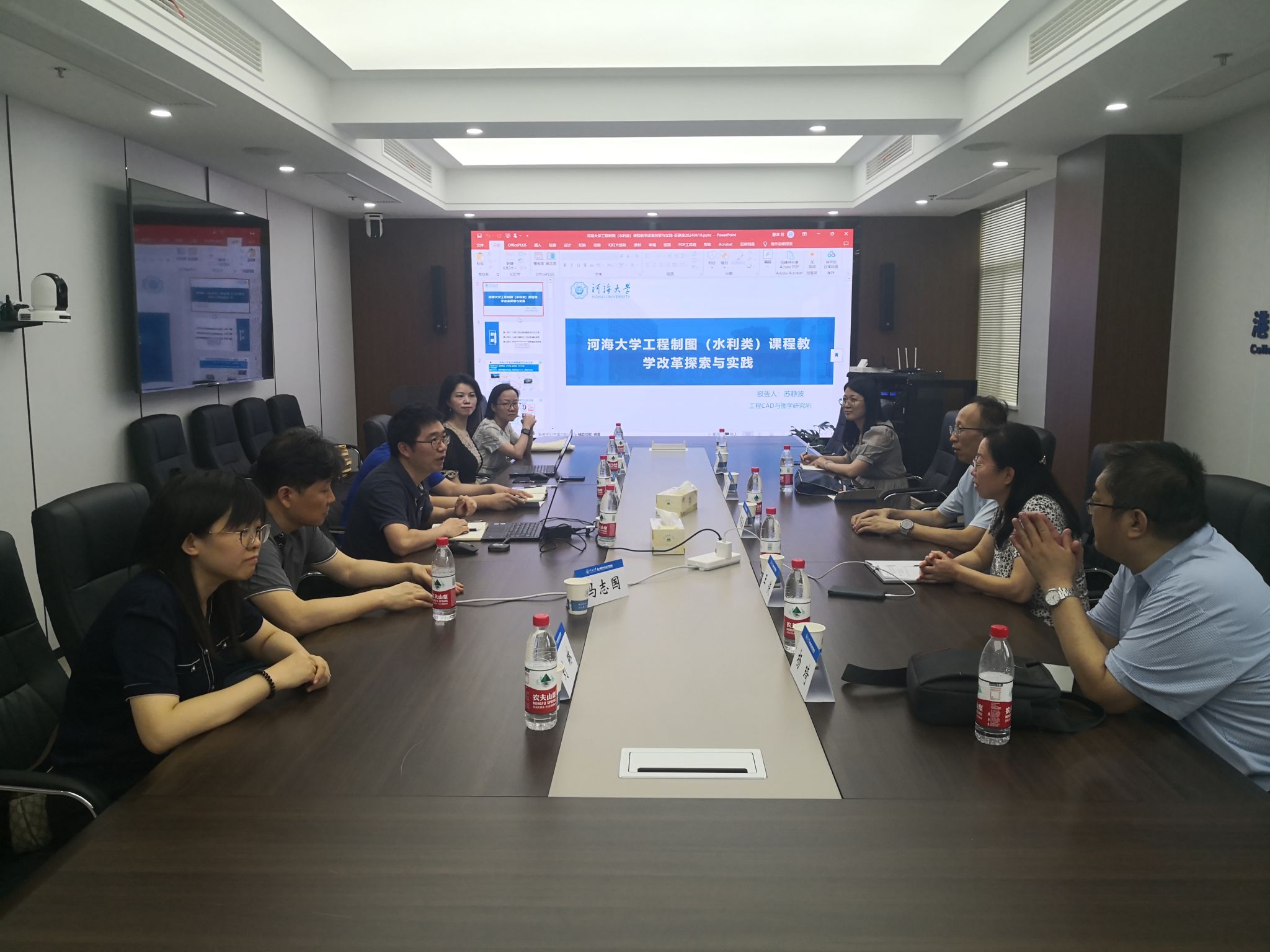 河海大学工程CAD与图学研究所所长苏静波教授带领全所教师热情接待beat365一行。在交流会上,苏静波介绍了河海大学工程制图课程的教材建设、线上课程建设、数字化教材建设、教学改革研究情况;工程制图教研室主任李昂介绍了工程制图类课程大纲修订情况;研究所钟春欣老师介绍了实践教学(图学竞赛)开展情况及所获成果。会谈结束后,beat365一行参观了河海大学江宁校区制图专用教室、教学模型室、智慧教室以及严恺馆港航综合展示平台。