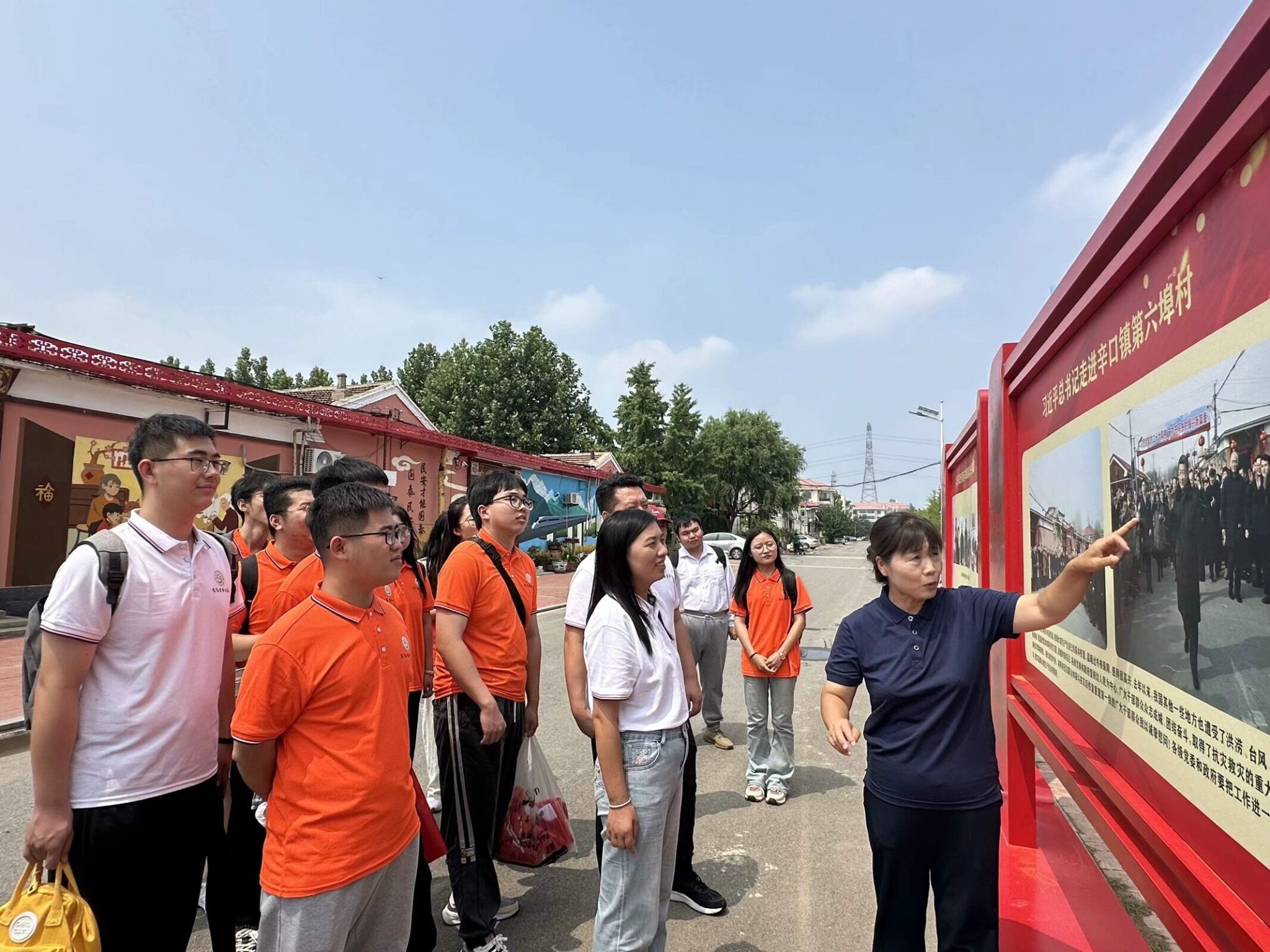 抵达第六埠村后,实践小分队沿着总书记足迹,先后参观了第六埠村党群服务中心、乡村振兴馆、抗洪大堤与抗洪精神展、生态六埠、体验式农业生态园。红色研学基地讲解员结合第六埠村的发展历程,深入阐释党的理论和政策,让青年们深入学习到第六埠村的创新发展精神与顽强抗洪精神。