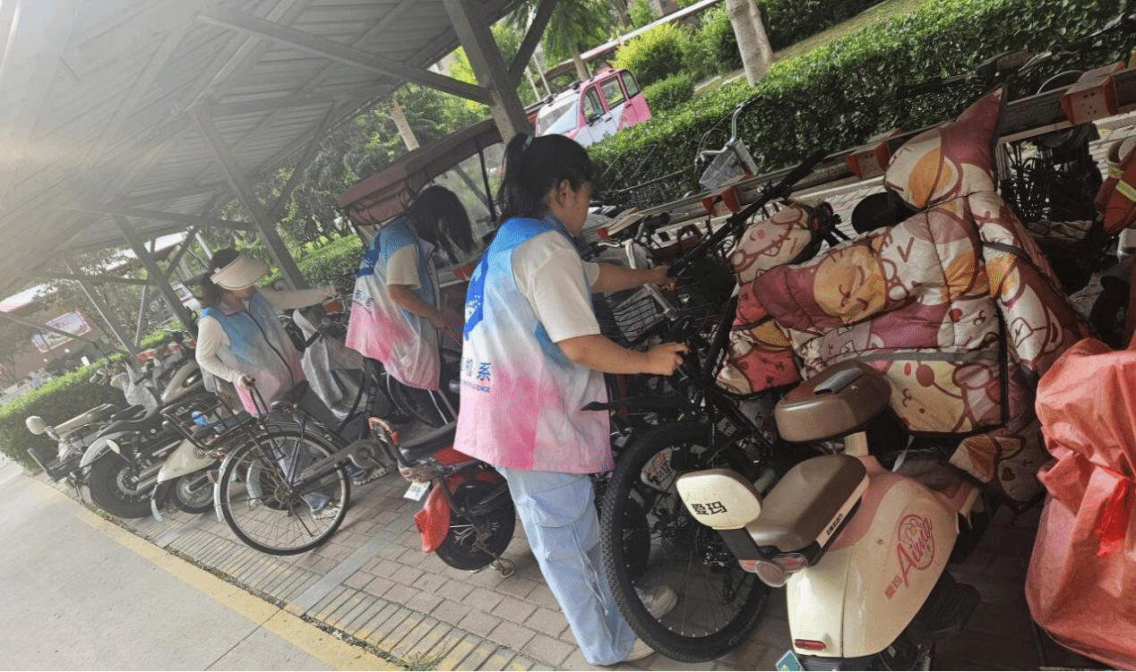 清洁小组的志愿者们手持扫帚、垃圾袋等工具,对社区道路、绿化带及休闲区进行了全面细致的清扫。经过一番努力,社区环境焕然一新,赢得了过往居民的一致好评。与此同时,另一组志愿者将被风吹倒的自行车一一扶起,把随意停放的自行车在指定的停车区域整齐排列,原本杂乱无章的停车区变得井然有序,不仅美化了社区环境,也方便了居民的出行。