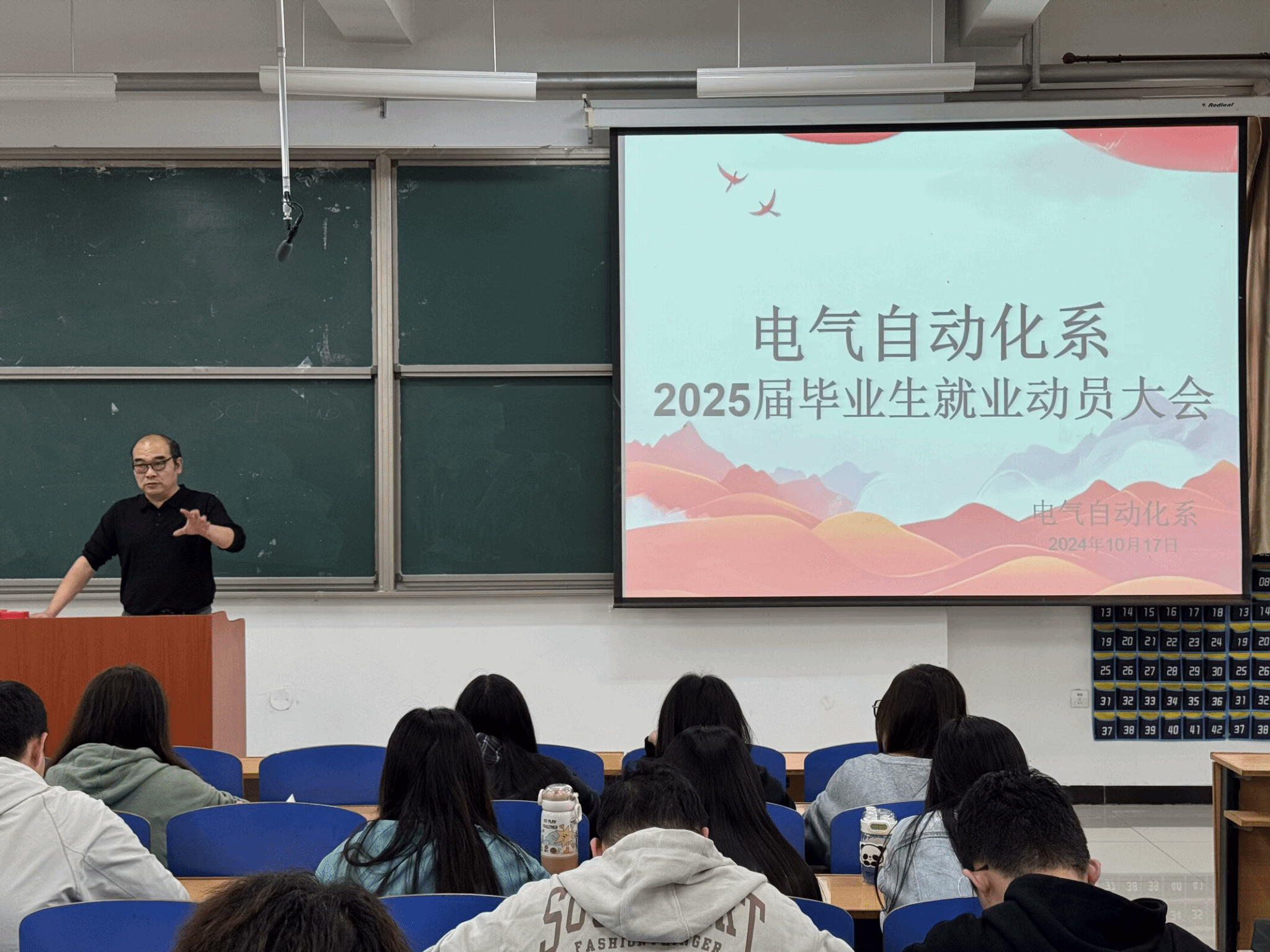 为帮助2025届毕业生了解就业形势、提高就业积极性、端正就业观念,10月17日,电气自动化系召开2025届毕业生就业动员大会,2025届毕业生代表参加会议,电气自动化系党总支书记葛洪伟、系主任唐勇出席本次会议。