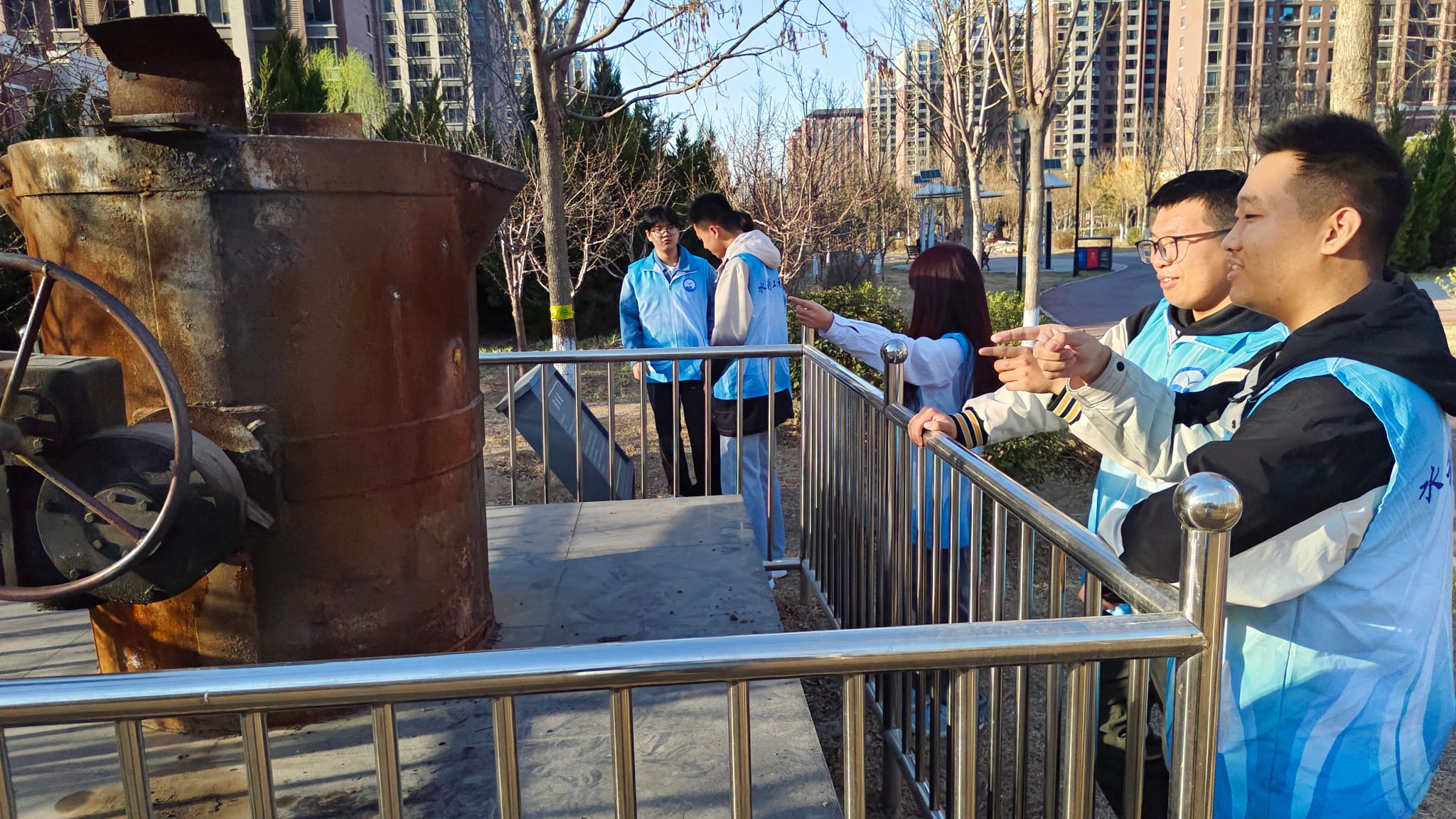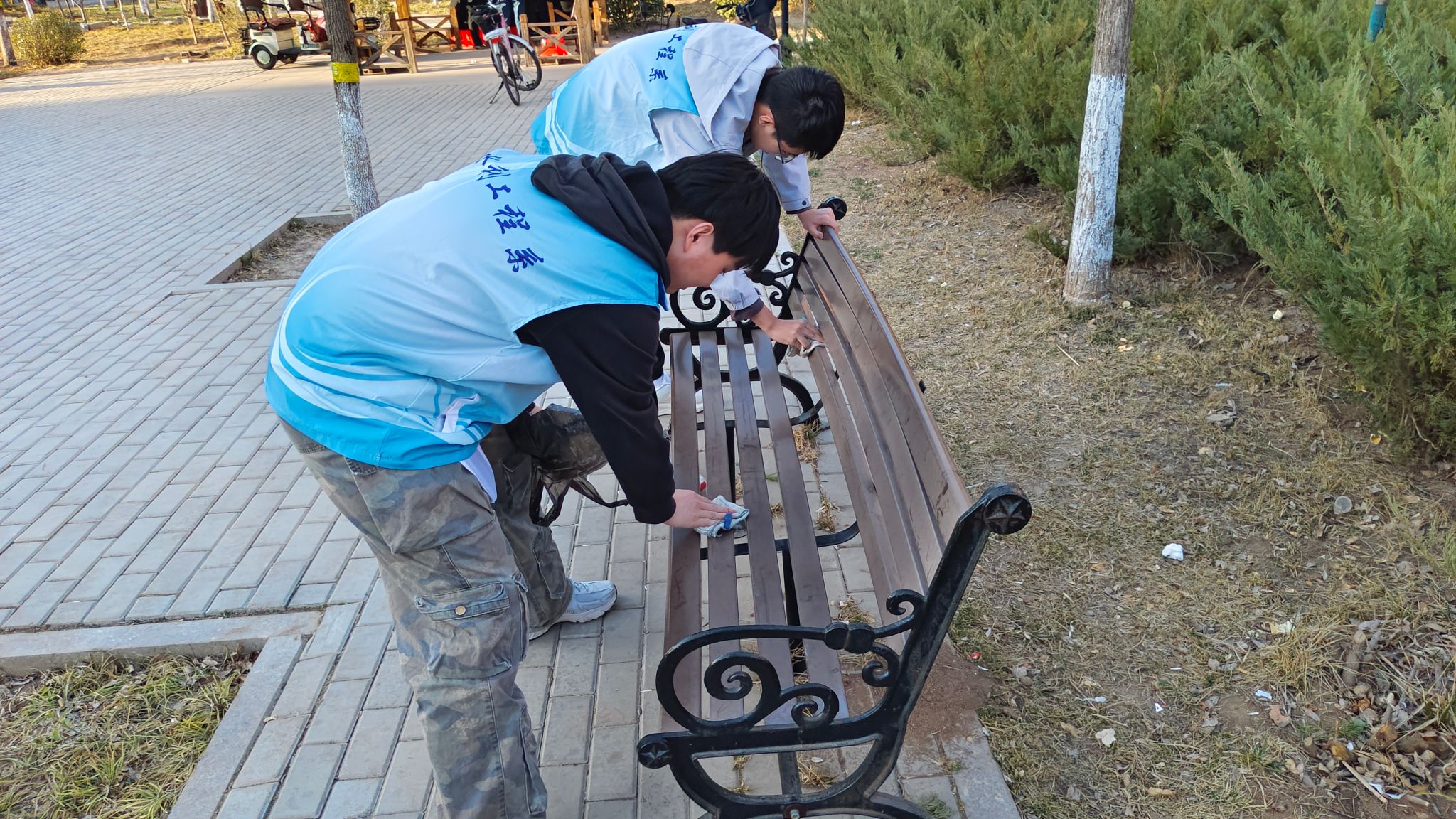 随后,志愿者们系统参观了劳动公园历史陈列区。通过观摩不同时期劳动工具展品、阅读劳模事迹图文资料,同学们深刻体悟到劳动精神与雷锋精神在价值追求、实践路径上的内在统一性。实践环节中,志愿者们携带清洁工具,对园区主干道、景观绿化带等公共空间展开系统化清洁维护,公园面貌焕然一新。