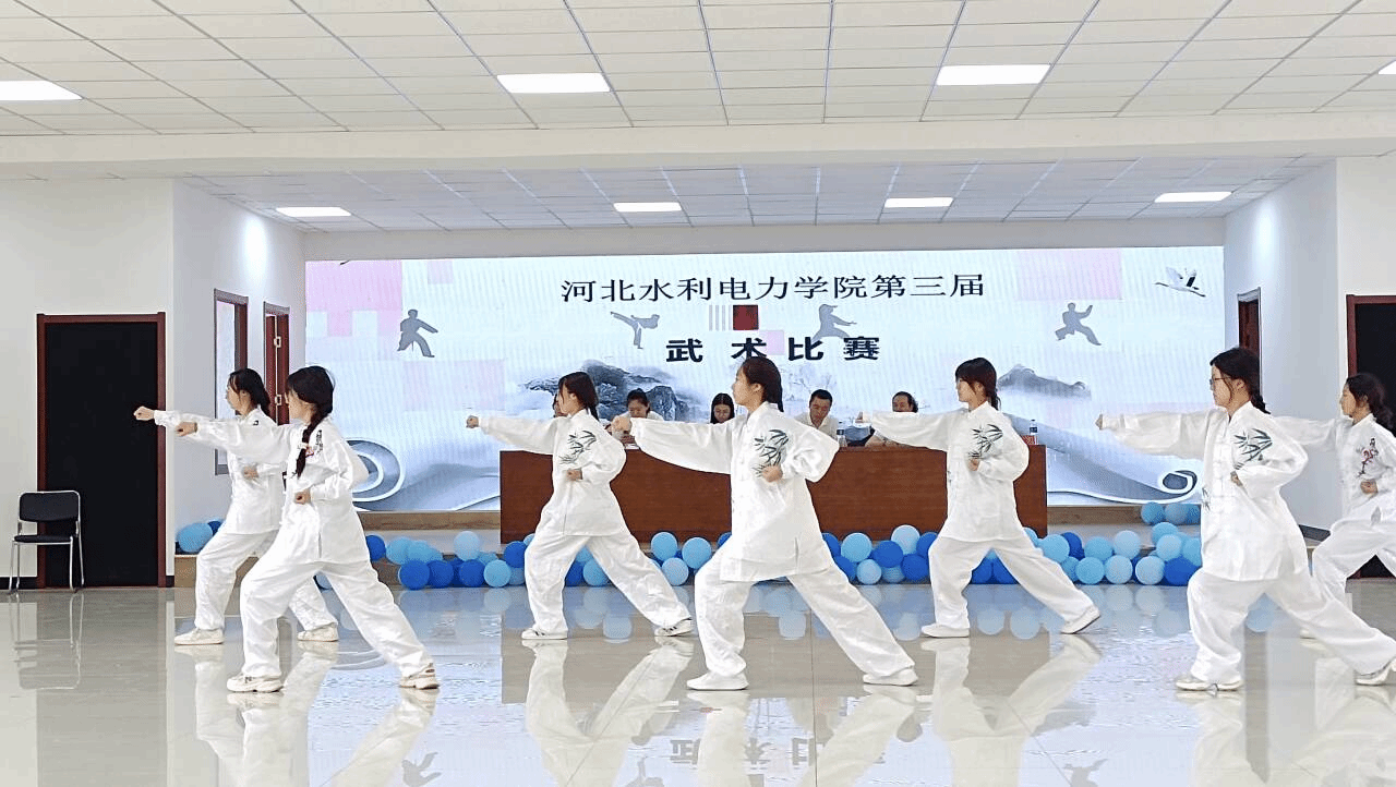 比赛设置拳术、器械及集体项目三大类别,涵盖一路长拳、二路长拳、军体拳等传统拳术,以及太极扇、刀、剑、枪等器械项目。选手们或刚劲有力、虎虎生风,或轻盈灵动、行云流水,一招一式尽显扎实功底,腾挪闪转间诠释了中华武术的独特魅力。集体项目中,各参赛队伍配合默契、气势如虹,充分展现了水院学子团结协作、昂扬向上的精神风貌。