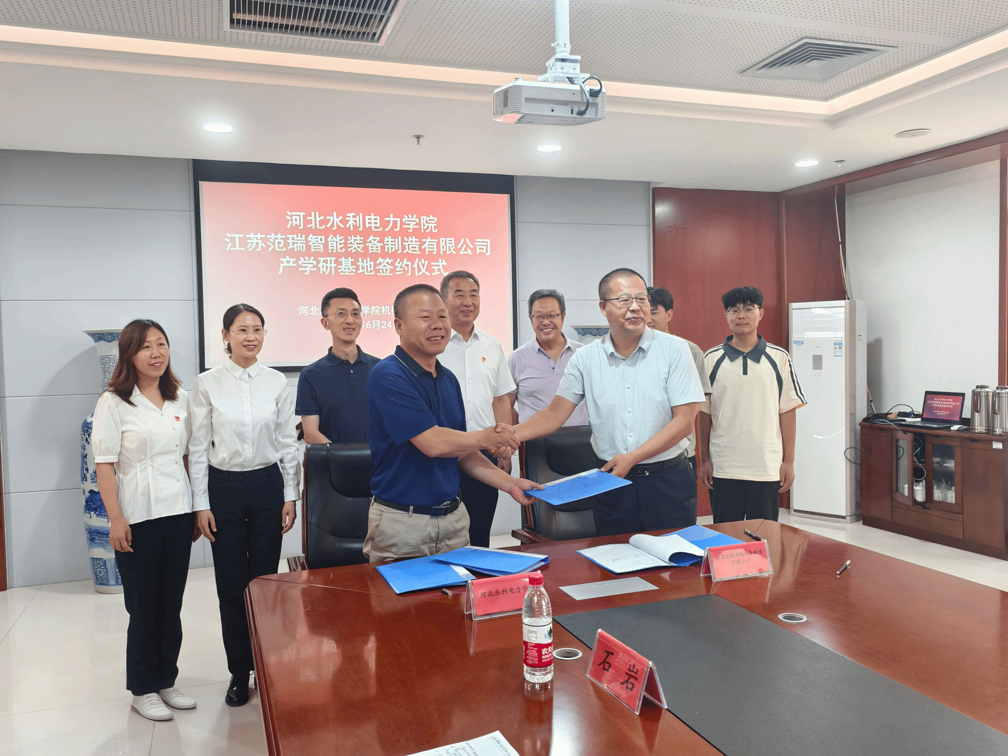 科技处处长蓝清,机械工程系书记路维、主任张铁壁、副主任石岩、机械设计制造教研室外聘教师陈恩平教授参加了本次签约仪式。
