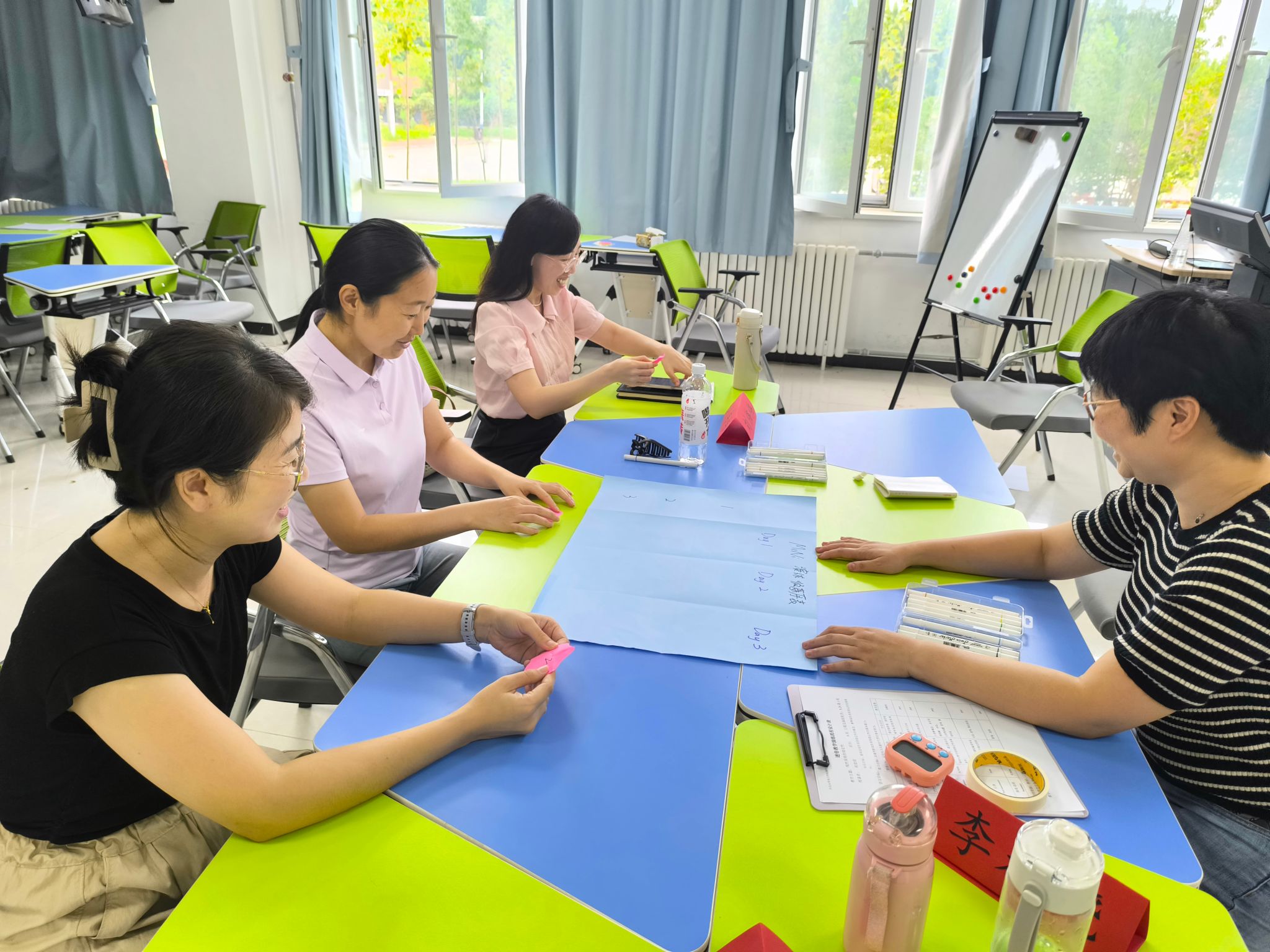 校本培训师团队根据培训目标提前精心打磨培训方案,细致设计每个教学环节,既兼顾理论深度,又注重实践操作。8月25日上午,一场别开生面的破冰行动正式拉开培训序幕,通过互动游戏、分组交流等形式,迅速打破参培教师间的陌生感,营造出积极活跃的学习氛围。在后续三天半的培训中,团队创新采用“微格教学贯穿+工作坊实操”模式,将教学理念解读、培训技巧演示、实战模拟演练等内容科学整合,节奏紧凑且重点突出。